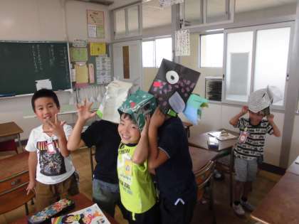 夏休みに作った海の生き物の帽子をかぶりました。友達の作った帽子とかえっこしてかぶったり、見せ合ったりして楽しみました。