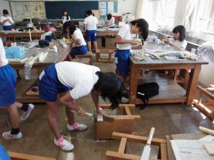 のこぎりや金づちを使って作品を作っています【9月21日(木)の4年生】 公開日 2017/09/21 更新日 2017/09/21 4年 図工の時間に木工の作品作りをしています。初めてのこぎりを使う子も多く、最初はこわごわでしたが、だんだんなれてきて自分のアイディアを形にしようとがんばっていました。