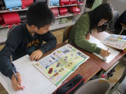前日の校外学習から学んだことを新聞にまとめました。車の組み立て方、自動車づくりの工夫など、分かりやすくまとめることができました。