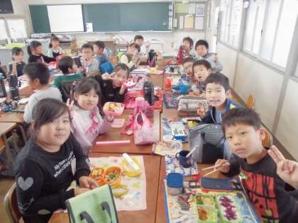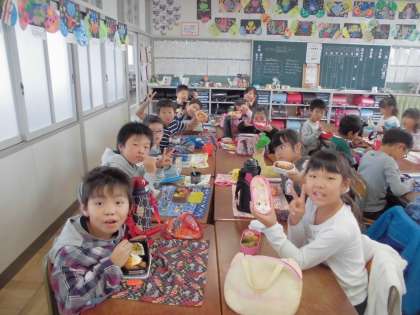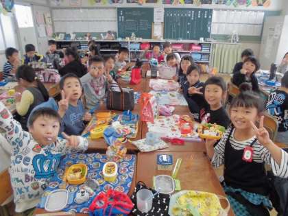 おいしかったね、お弁当【10月23日(月)の2年生】 公開日 2017/10/23 更新日 2017/10/23 2年 今日は、台風の影響で大変だったと思いますが、元気に学校に来れましたね。給食は中止だったため、みんなでお弁当を食べました。気持ちのこもったお弁当を、みんな嬉しそうに食べていました。朝早くから準備していただき、ありがとうございました。