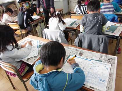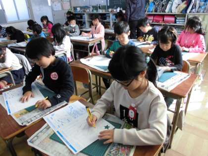 これから図工では、カッターナイフを使った作品つくりに取り組みます。今日は、カッターナイフの使い方の練習をしました。曲線や直線に合わせて上手にきることができたかな?