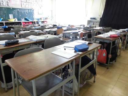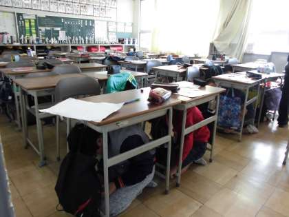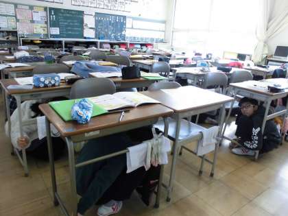 緊急地震速報を聞いた後のシェイクアウト訓練に参加しました。シェイクアウト訓練とは、地震の際の安全確保行動1−2−3「まず低く、頭を守り、動かない」を身に付ける訓練です。写真は高学年ですが、緊急の放送を聞いて、考えて素早く行動することができていました。
