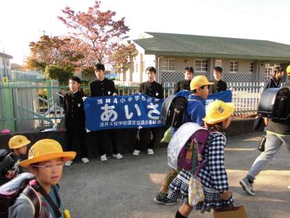 あいさつ運動【11月2日(木)の生活広報委員会】 公開日 2017/11/02 更新日 2017/11/02 児童 生活委員会は、主にあいさつ運動、かめさん運動といった2つのことに取り組んでいます。毎週月曜日に門に立って挨拶をしています。