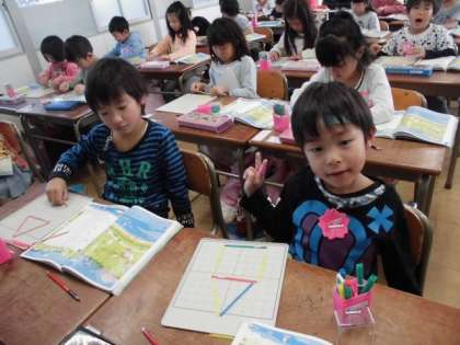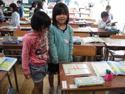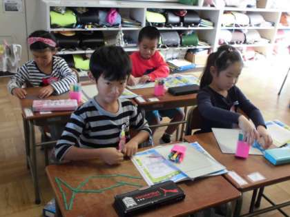 算数では形づくりの学習をしています。今日は、棒を使って様々な形を作ることに挑戦しました!はじめは「むずかしいな〜。」と話していた子も、作っていくうちに段々と慣れていきました。授業の最後はオリジナル作品に取り組みました。星を作ったり、算数の計算式をつくったりして楽しみました。