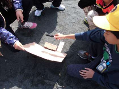光を集めて 【11月15日(水)の3年生】 公開日 2017/11/15 更新日 2017/11/15 3年 理科で、虫眼鏡で光を集める実験をしました。光を集めると厚い段ボールにも穴をあけられることが分かりました。
