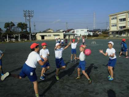 体育の時間にはポートボールを行いました。広いコートで長いパスを行ったり、短く多くパスを行ったりと、ボールが激しく動く試合でした。寒い中でしたが、元気よく試合を行いました。