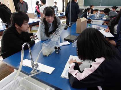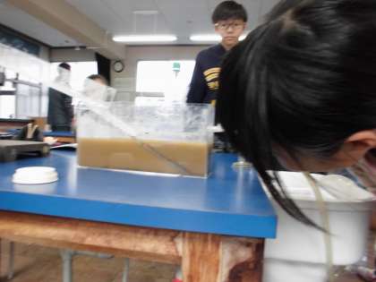 地層を作る実験装置を使って、地層のでき方を調べました。上手に地層が重なる様子を確認することができた班がたくさんありました。
