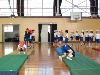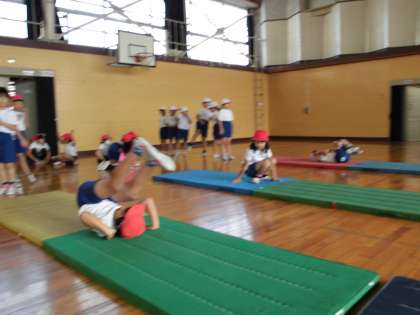 マット運動 【11月16日(木)の2年生】 公開日 2017/11/16 更新日 2017/11/16 2年 マット運動では、発表会に向けての練習を繰り返しました。ろく木を使って、壁倒立の練習もしました。