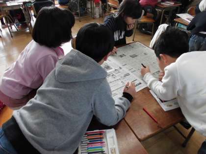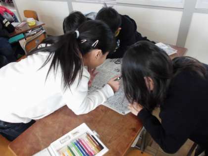 3年生ふれあいタイム【11月17日(金)の3年生】 公開日 2017/11/17 更新日 2017/11/17 3年 ふれあいタイムは「新聞言葉探しゲーム」をしました。グループ対抗で新聞紙の中からお題の文字を探すという遊びです。みんなとても集中して新聞紙を眺め、グループでたくさんの文字を見つけて楽しんでいました。