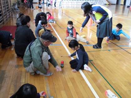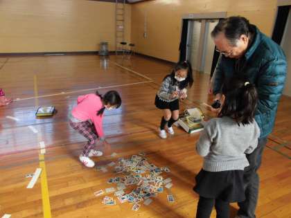 昔遊びの会 その1【11月21日(火)1年生】 公開日 2017/11/21 更新日 2017/11/21 1年 今日は、地域の方に昔の遊びを教えていただきました。子どもたちは、班ごとに七つの遊びを体験しました。優しく教えてもらえたので、多くの子が上達しました。 めんこ遊びでは、力強く投げようと頑張っていました。だるま落としでは、素早くたたくと成功することを教えていただきました。