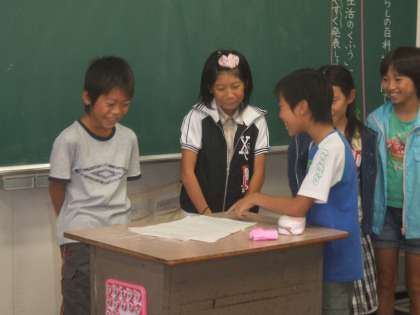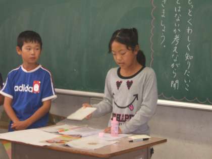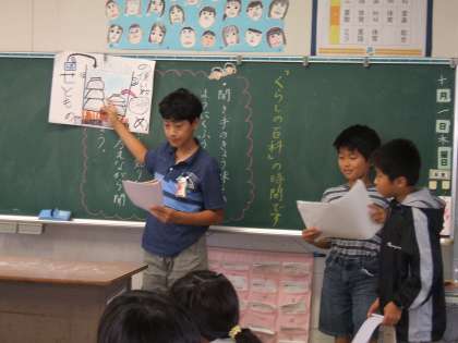 国語の授業で、「生活のくふう」について調べ、発表しました。グループに分かれて、調べたことを基に台本を作り、紙芝居にしたり、実物を見せて実演したり、生活場面を劇にしたりして、分かりやすく説明できるよう工夫しました。いろいろな「生活のくふう」が楽しく紹介されました。