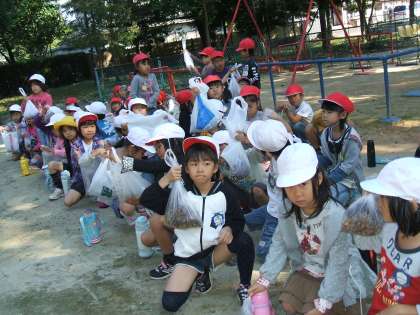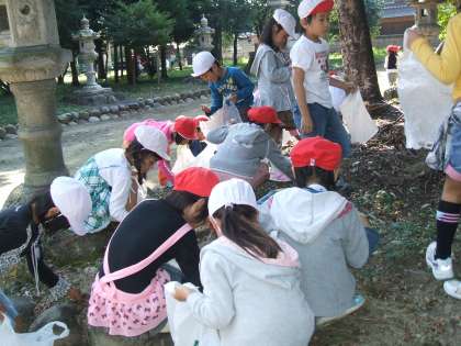10月13日、白山社に秋みつけにでかけました。どんぐり、まつぼっくりなどをたくさん拾いました。かさ付きのどんぐりをみつけると「やったー」と喜んだり、きれいな色のものをみつけて自慢して見せてくれたり、楽しそうな表情を見せていました。集めたものを使ってペンダントを作る予定です。