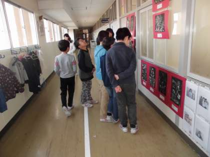 初めて作成した木版画。今、4年生の全作品が廊下に掲示してあります。そこで、他のクラスの作品も鑑賞するこことにしました。「色遣いがきれい。」「三角刀の使い方がとても上手だと思いました。」などいろいろな感想を伝えあいました。