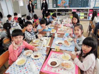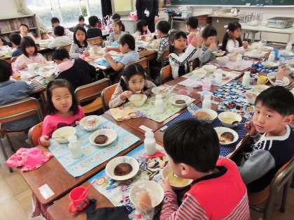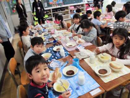 1年生にとっては初めての学校給食です。みんなおいしそうに食べていました。