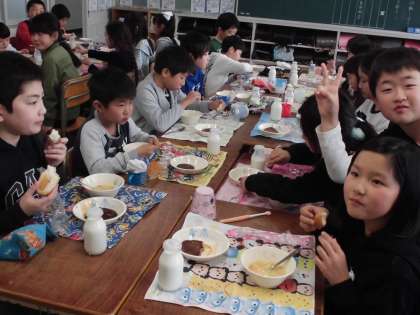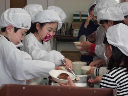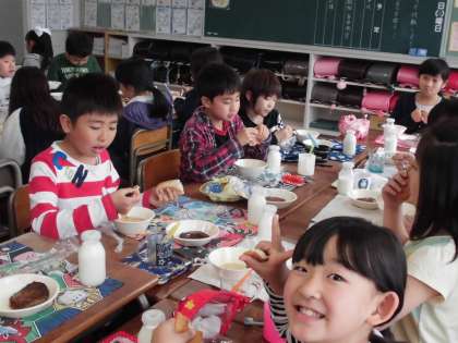 今日から給食が始まりました。みんなで協力し合って、準備ができました。おいしい笑顔がたくさん見られました。