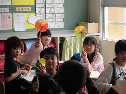 角の学習に入る前に、折り紙を使って扇を作りました。