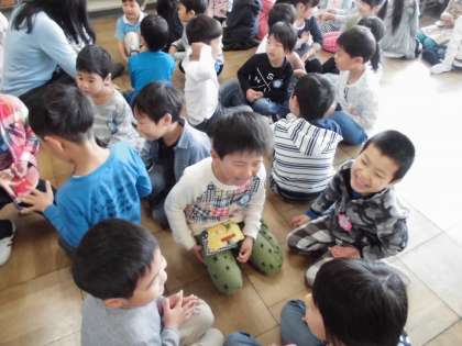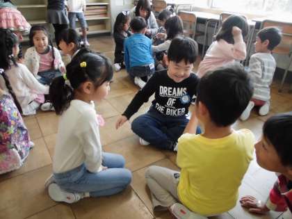 楽しかった わくわくタイム〔4月13日(金)の1年生〉 公開日 2018/04/13 更新日 2018/04/13 1年 ワクワクタイムの自己紹介ゲームでは、始めは、二人組になり、途中から3人組になりました。3人でグループを作るときは、歓声があがりました。自己紹介した後、輪になって握手をし、笑顔で話していました。一年生全員で交流する時間は、子供たちにとって園の友達に会えるほっとした時間でもあり、楽しい時間でもあるようです。