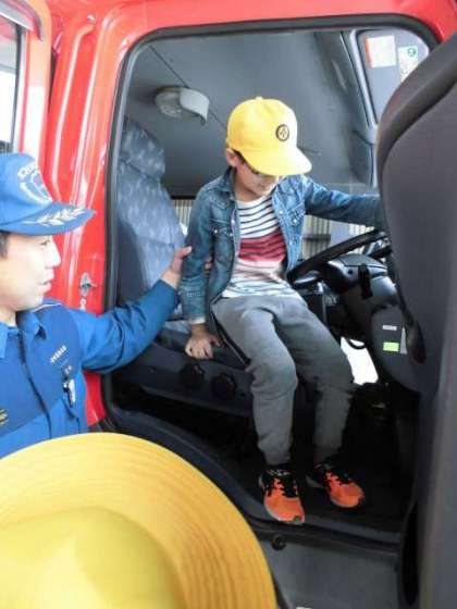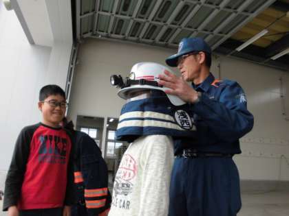 浅井・西成消防出張所へ行ってきました。防火服を着せてもらったり、消防車に乗せてもらったりしました。