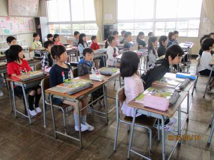 初めての音楽の授業がありました。姿勢よく話を聞き、これからの授業が楽しみになったようでした。