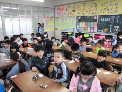 ペアの6年生と顔を合わせました。名前を言って名刺を渡しました。お兄さんやお姉さんからも名刺をもらいました。これからペアでいっぱい触れ合えるのが楽しみですね。