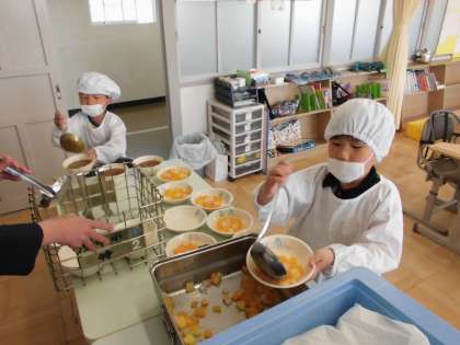 みんなで協力して給食の準備をしています。 1年生も上手につけ分けられるようになりました。