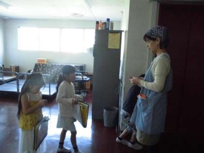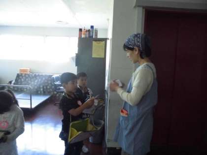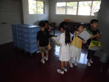 友達と学校探検したよ【5月24日(木)の1年生】その6 公開日 2018/05/24 更新日 2018/05/24 1年 コンテナ室にはごはんやデザートが届いていました。用務員さんと名刺交換もできました。