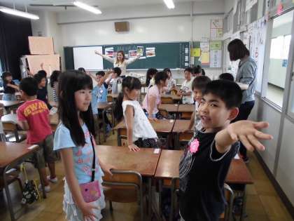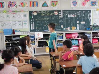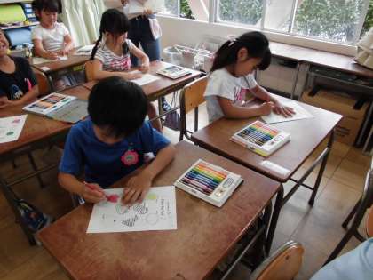 はじめての英語活動 その2【5月29日(火)の1年生】 公開日 2018/05/29 更新日 2018/05/29 1年 果物や色を英語で言いました。大きな声で発音していました。また、二人一組で、大きな身振りをつけてあいさつのしかたを練習しました。最後は、果物のの色を英語で言って、色塗りをしました。とても楽しくて、元気いっぱい笑顔いっぱいの授業でした。