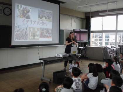 国際交流【5月30日(水)の5年生】 公開日 2018/05/30 更新日 2018/05/30 5年 5年生はイタリアの祭りについてお話を聞きました。オレンジを投げ合う祭りや人間チェスなど、おもしろい祭りがたくさんありました。後半は伝言ゲームを行いました。