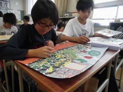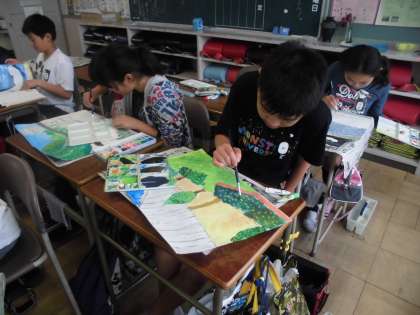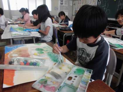 写生大会の様子です。雨が降っていたので、教室で色塗りをしました。