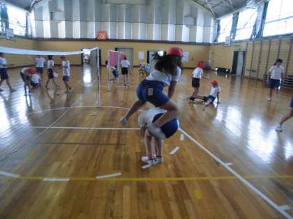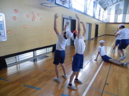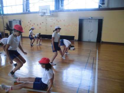 怪我をしないように、準備運動は体育の基本ですね!!
