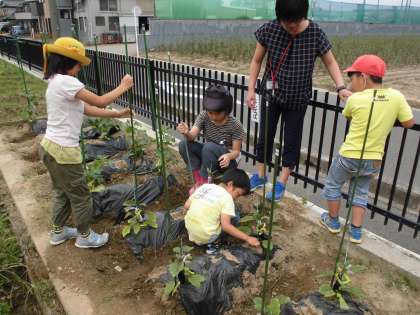 ナスやキュウリの苗がぐんぐん大きくなります。今日も新たに支柱を立てて、しっかり結びつけました。