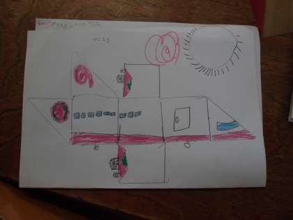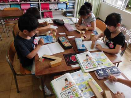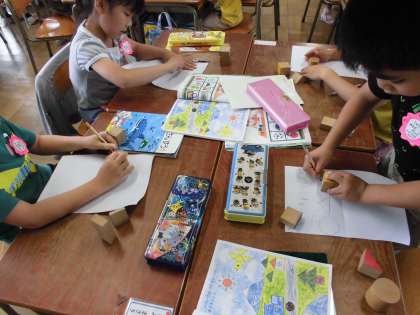 積み木の形を紙にうつして絵をかきました。視覚や三角、丸の形を生かして楽しく書くことができました。