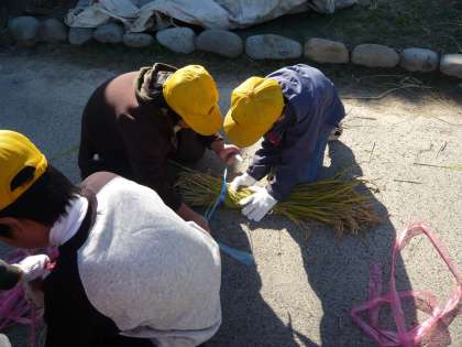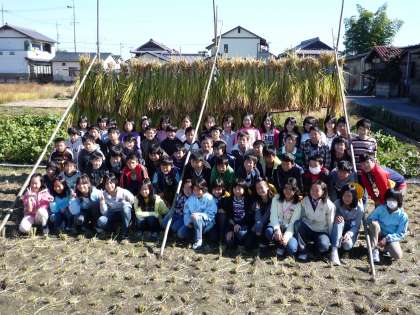 収穫の時期を迎え、昔ながらの方法で稲刈りをしました。初めて使う「かま」でしたが、リズムよく稲をかることができました。刈った稲を束ねて、ひもでしばる作業が意外と難しかったようです。すぐにばらばらになる稲束もありました…そして、竹を組み合わせて作った干し場に、はさにかけました。