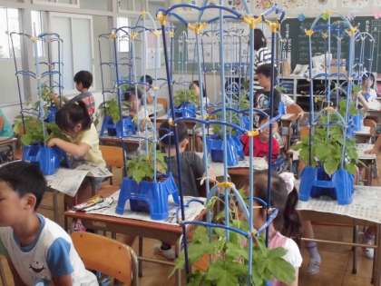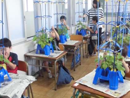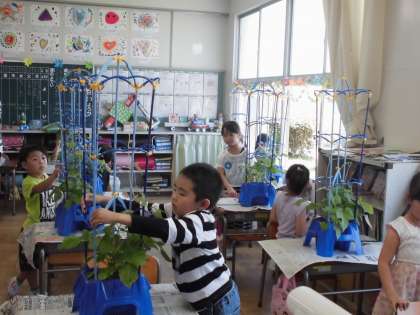 支柱を立てたよ【6月13日(水)の1年生】 公開日 2018/06/13 更新日 2018/06/13 1年 今日は、あさがおの成長で気づいたことをクラスであげました。「つるがのびてきたよ。」「きいろいはっぱがある。」「はっぱがふえた!」など、たくさんの変化に気づきました。また、このままだと、つるが折れてしまったり、栄養が足りなくなったりしてしまうので、支柱を立てたり、追肥をあげたりしました。草抜きもして、大切にお世話ができました。元気に育ってほしいね。