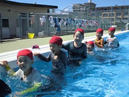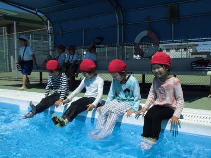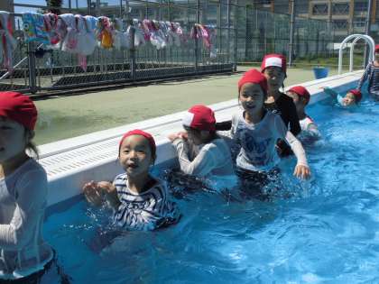 着衣泳をしたよ その2【6月13日(水)の1年生】 公開日 2018/06/13 更新日 2018/06/13 1年 肩まで浸かってから、手すりをつかんで、かにさん歩きをしました。「あるいてみてどう?」と聞くと、「おもいなあ。」「あるきにくい。」という意見をたくさん聞きました。
