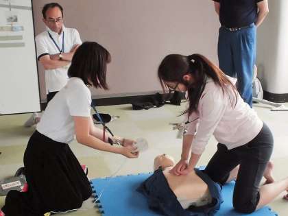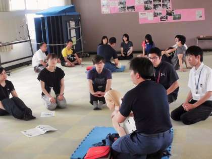 先生たちの勉強会「救急救命法」【6月14日(木)】 公開日 2018/06/14 更新日 2018/06/14 校長室より 今週から水泳の授業も始まります。また、水の事故が心配な季節になりました。 子どもたちの大切な命を守る立場にある教職員は、万一の際に備えて応急措置ができなくてはなりません。そこで、浅井消防署員の方に来ていただき、「心肺蘇生法」と「ADE」の使い方について現職教育を実施しました。実習を通して、安全に対する気持ちを高めることができました。