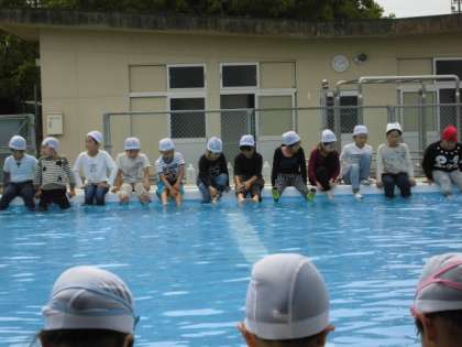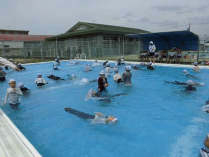 今日は、着衣泳を行いました。服が水を含んで思うように身動きが取れないことを体験しました。また、ペットボトルをつっかて浮く練習をしました。小さなペットボトルに必死にしがみついてしまうので、力を抜けずなかなか浮くことのむずかしさを感じた着衣泳でした。