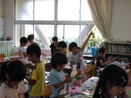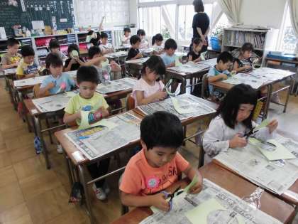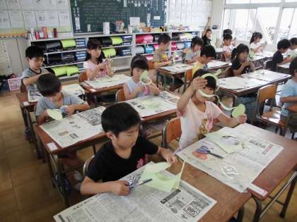 チョキチョキかざり その1【6月14日(木)の1年生】 公開日 2018/06/15 更新日 2018/06/15 1年 ハサミの正しい使い方を確認し、うずまきの線に合わせ、紙を細長く切りました。また、色紙を折って切って、花やハートの形を作りました。最後に、作ったものを貼りあわせ、廊下に飾りました。