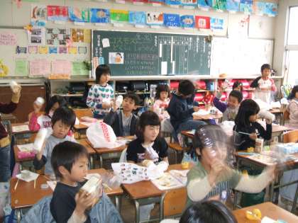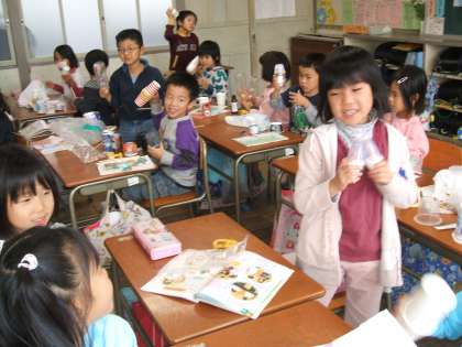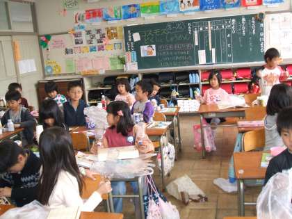 音楽で「すてきなおとをさがそう」という学習をしています。先日、自分たちの身近にあるもので手作り楽器を作りました。できあがった後、「♪すずめがちゅん」の曲に合わせて楽器を鳴らし合いました。素敵な音が響いて、とても楽しい時間でした。