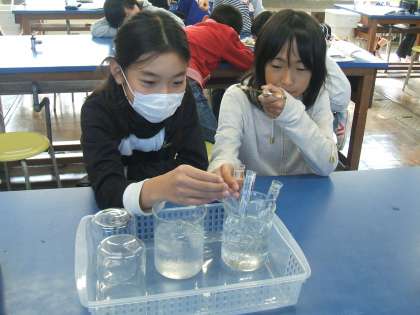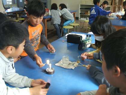 理科の実験 公開日 2009/11/09 更新日 2009/11/09 4年 「温度が変わるとかさが変わるかどうか」を実験をして調べました。今回の実験では、アルコールランプを使いました。マッチで火をつけるのが初めての子が多く、授業後、「こわかった。」「ドキドキした。」という声が聞かれました。火は便利なものであるけれど、正しく使わないと危険なものになってしまうということも学ぶことができました。