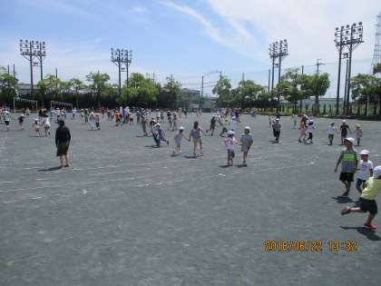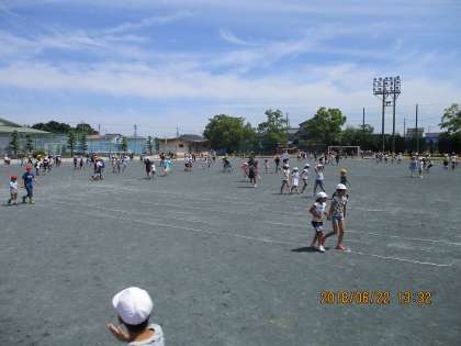写真を見て分かるように、手をつないだ鬼ごっこにして、とても楽しく、好評でした。