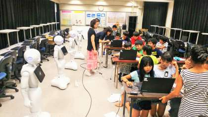 Pepperプログラムの授業をパソコン教室で実施しました。職員が気をもむ以上に、子どもたちはパソコン操作でPepperを上手に動かすことができています。今日は、Pepperの言う言葉を自分たちで考えて、パソコンに打ち込む作業、実際にその通りに話すのかの確認を役割を分担して行いました。自分の名前を打ち込むだけではなく、「今日は暑いぞ」「美しい千尋先生」など、Pepperの前に立つ人を考えて言葉を打ち込んでいる人もいました。これからは、さらに複数の動作などを組み込むプログラムにも挑戦できそうです。子どもたちがどんなプログラムを作るのかが、とても楽しみになってきました。