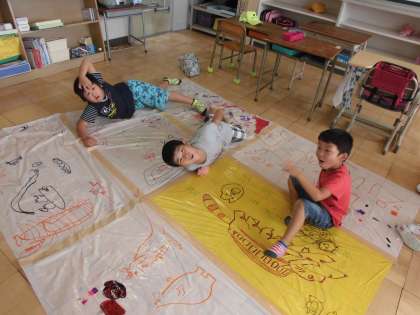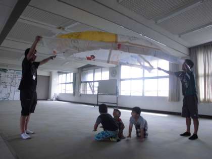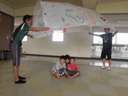 造形遊び【9月6日(木)のたんぽぽ】 公開日 2018/09/06 更新日 2018/09/06 たんぽぽ 昨日絵をかいたビニールをつなぎ合わせました。 人数が足りなかったので、先生にも手伝ってもらいました。 ふわっとできたドームの下に入ると風がおきて...面白い!!
