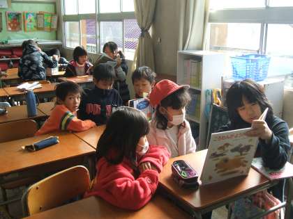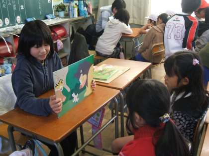 ふれあい読書 公開日 2009/12/15 更新日 2009/12/15 4年 コスモス読書週間の期間中に行われる予定だった、2年生とのふれあい読書が、インフルエンザのために延びて、今日行われました。4年生の子どもたちは、準備しておいた紙芝居や絵本などを、2年生の子どもたちに一生懸命読んで聞かせていました。ちょっぴりお兄さんお姉さんらしく見えました。どちらもうれしそうで、ほのぼのとした雰囲気でした。