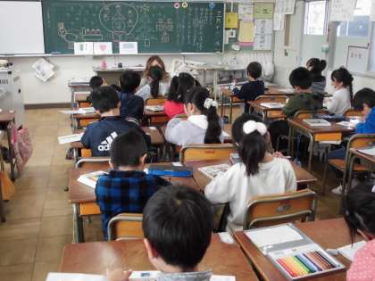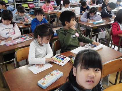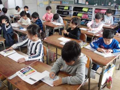 英語の時間 【12月12日(水)の1年生】 公開日 2018/12/13 更新日 2018/12/13 1年 英語の時間に、丸や三角、四角、、星、ハートなどの形の言い方を教えてもらいました。最後に、形を組み合わせて、ツリーやサンタやをカードにかいてクリスマスカードを作りました。英語の先生にシールのプレゼントをもらって、喜んでいました。