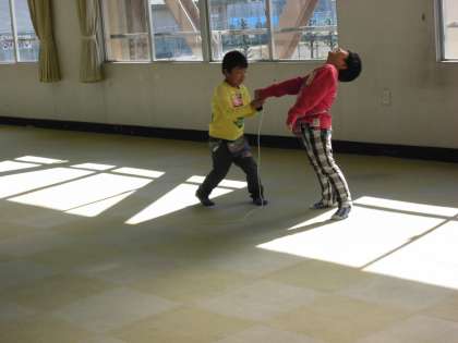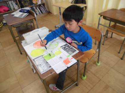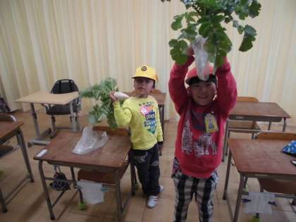 2学期の初めから育ててきた大根の収穫をしました。絵の具できれいなシャボン玉の色を塗りました。こまを教え合いながら遊びました。
