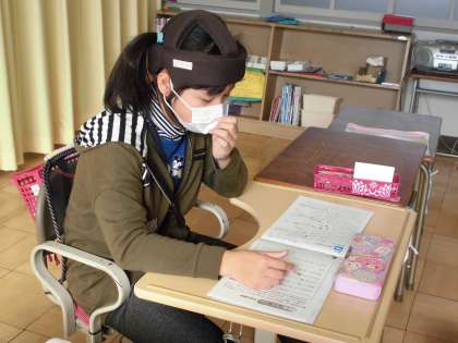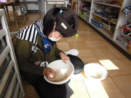 放課はひなたぼっこをしながら、豆つかみをして指先トレーニング。