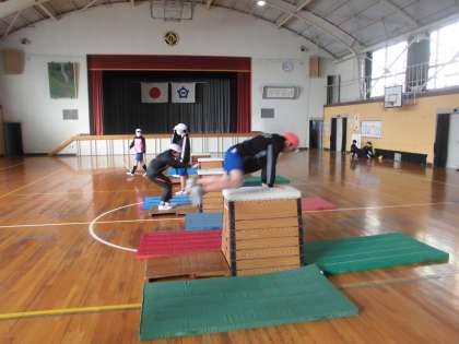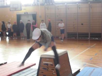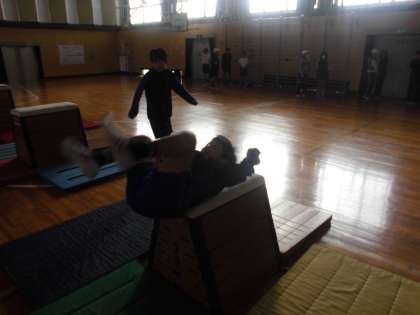 「今」できる技は?? その2【1月11日(金)の6年生】 公開日 2019/01/11 更新日 2019/01/11 6年 開脚とび、台上前転、抱え込み跳びの三つの技を練習してみて、今の時点でできる技を確認しました。これからの練習でできる技を増やしていこう!