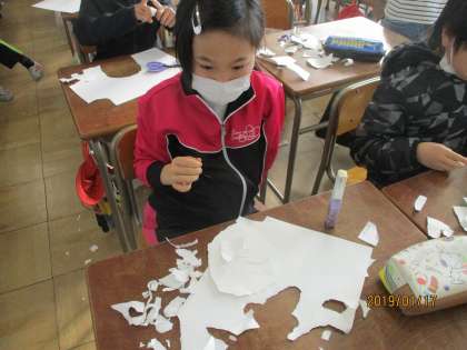 図工の時間です。画用紙を手でちぎって、一輪車に乗っている様子を表現します。