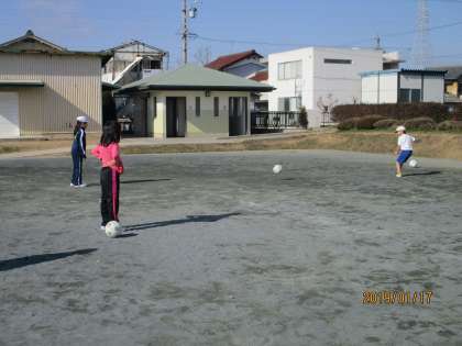 仲間にパスをしてボールをつないだり、強くボールをけれるよう練習をしました。